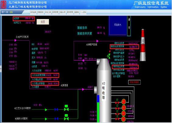 三門峽華陽發電有限公司2x320MW機組煙氣超低排放改造工程是我公司第一個脫硫脫硝除塵超低排放項目,該項目採用我司自主設計的雙托盤+高效除霧器脫硫除塵一體化技術,在鍋爐100%BMCR工況下,吸收塔入口粉塵和SO2濃度分别爲24mg/Nm³和5200mg/Nm³,出口排放濃度分别爲粉塵<3mg/Nm³和SO2<14mg/Nm³。